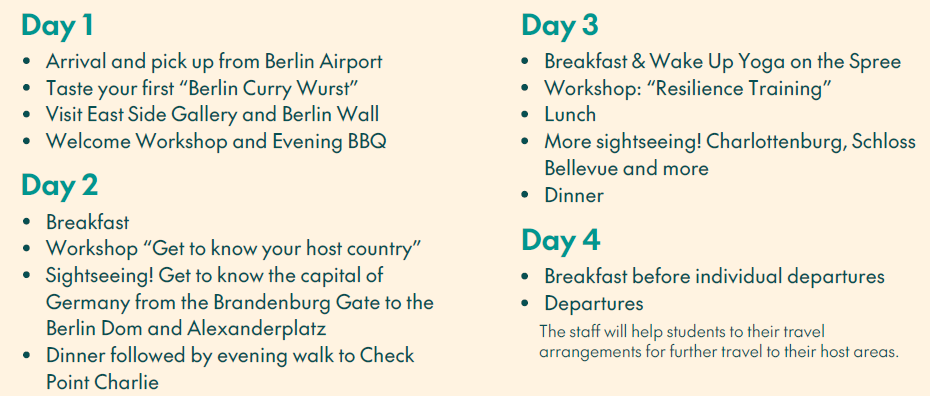The Welcome Camp includes: 3 nights in a youth hostel, full board, a city tour, transfers from the airport to the hostel and to the host family.